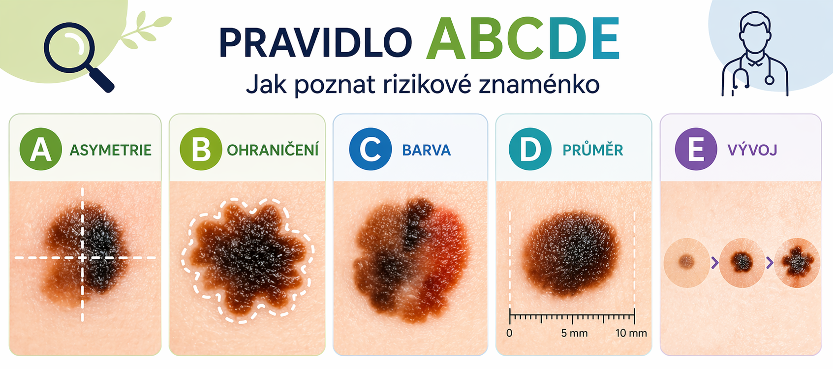 pravidlo ABCDE. Pokud u jakéhokoli znaménka zpozorujete některý z těchto bodů, je čas objednat se na kožní: