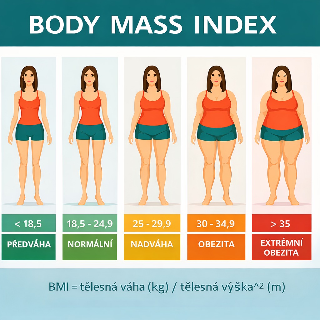 Nejčastěji se používá orientační ukazatel BMI (Body Mass Index), který se vypočítává jako