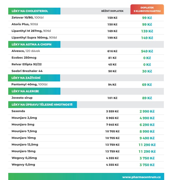 Informace k ceníkům: Výše doplatků uvedená v ceníku je platná k 1. 5. 2025. Ukázkový ceník uvádí pouze příklady léků vázaných na lékařský předpis, u kterých s klubovou kartou Lékáren Pharmacentrum k uvedenému datu ušetříte. Běžný doplatek je doplatek v lékárnách Pharmacentrum bez započítání slevy pro držitele klubové karty. O aktuální výši doplatku u vybraného léku se prosím informujte ve své lékárně Pharmacentrum. Cílem poskytnutí slevy není podpora zvýšeného prodeje a předepisování léčiv. Nejen vzhledem ke změnám cen výrobce, či změnám úhrady si společnost MEDICON Pharm vyhrazuje právo na změnu cen.